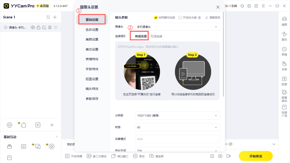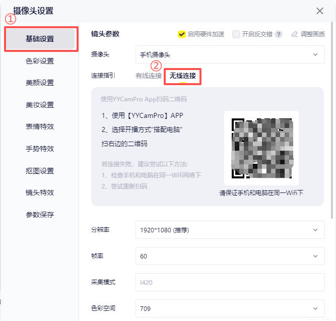 连接成功后,您可在电脑端YYCam Pro 中调整:分辨率、帧率、旋转/镜像、画面方向等。