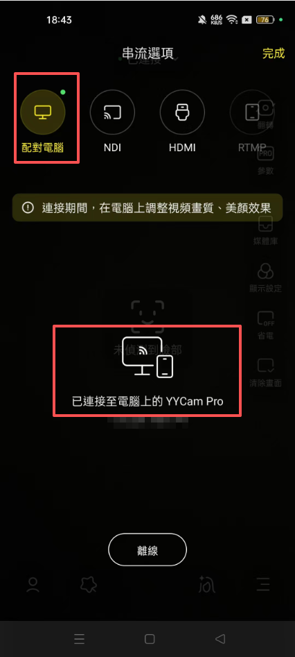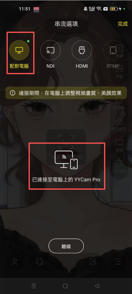- 连接成功后,手机画面会实时显示在电脑端 YYCam Pro 中。