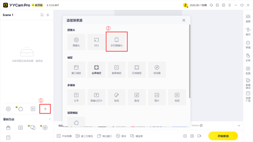 - 点击左侧菜单栏「+」,选择「手机摄像头」。