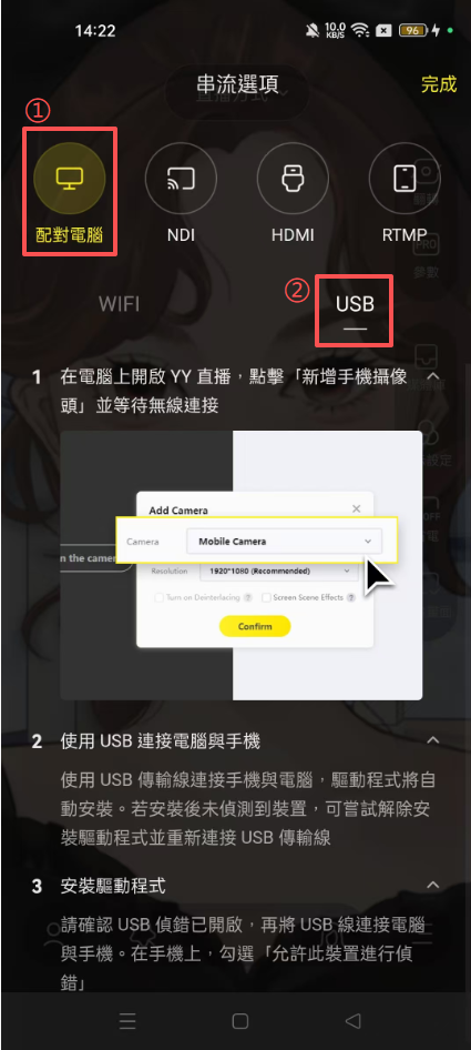 - 打开手机端 YYCam Pro App,在「直播方式」中选择:「Match‑PC」→「USB」。