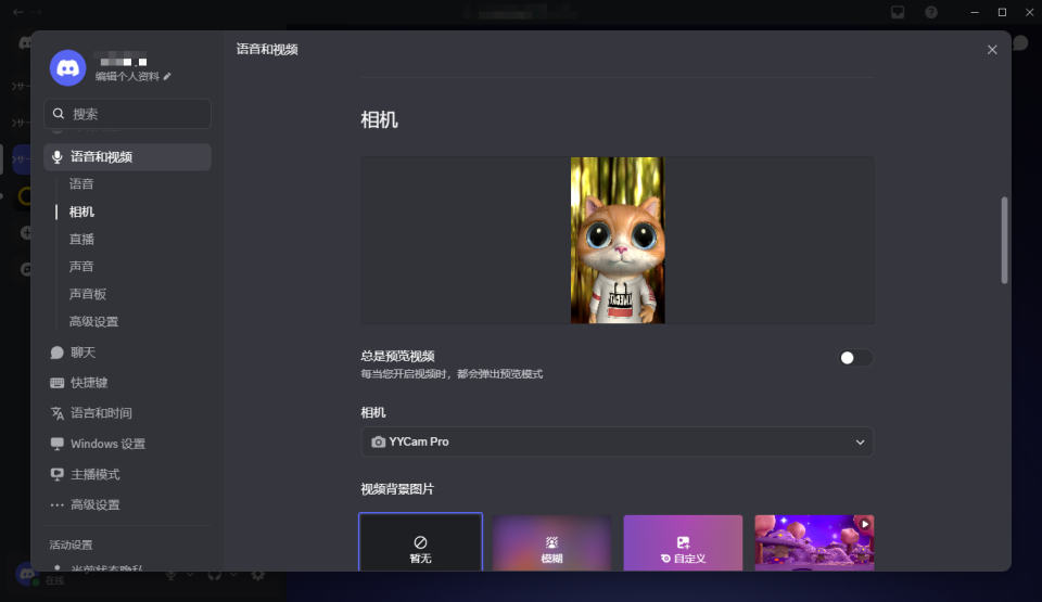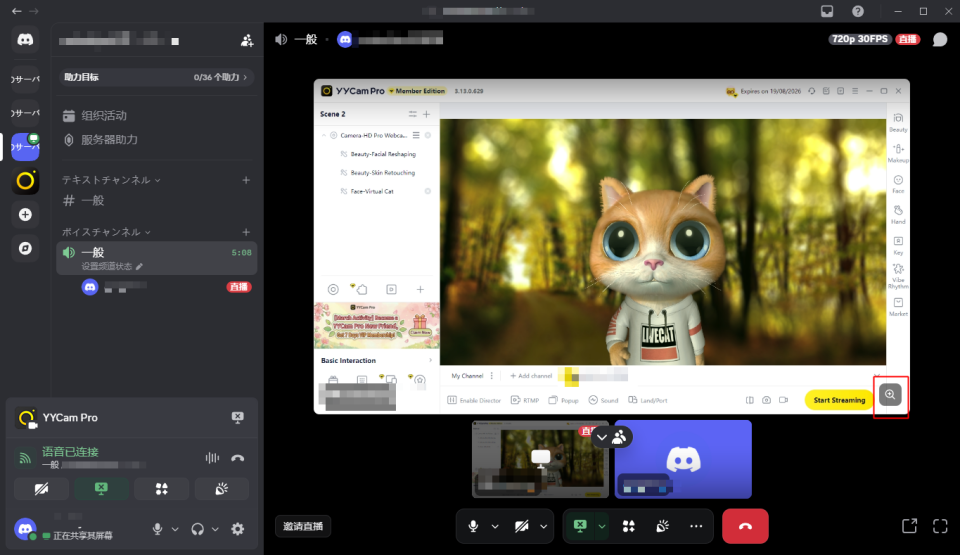 提示:如果你想在直播中既有“YYCam Pro 虚拟摄像头画面”,又要展示桌面内容,常见做法是:在 Discord 里开启视频(用 YYCam Pro 虚拟摄像头)同时共享屏幕/窗口(展示演示内容)观众可在频道里选择观看视频画面或屏幕共享内容(以 Discord 展示逻辑为准)。