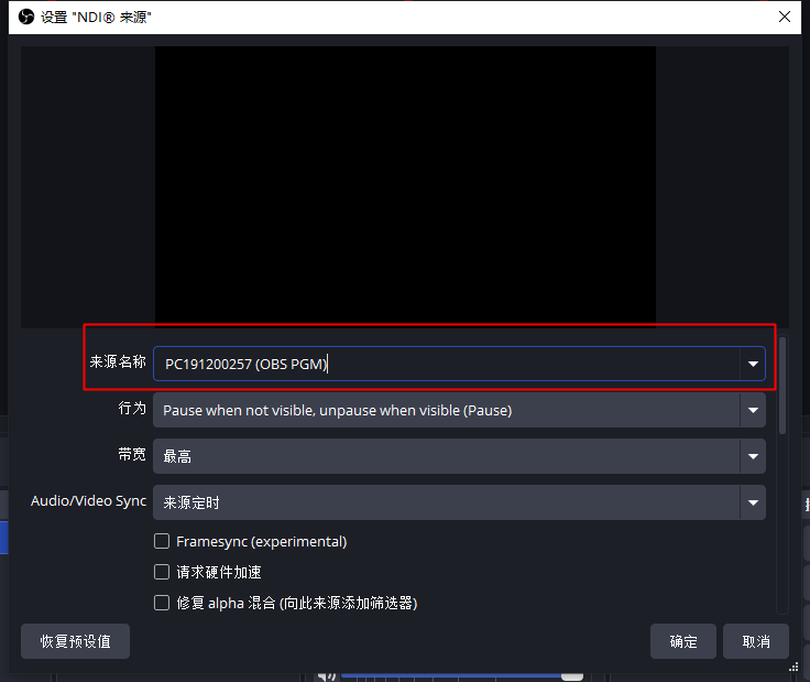 3. 从可用 NDI 源列表中,选择您在 OBS 中设置的名称。