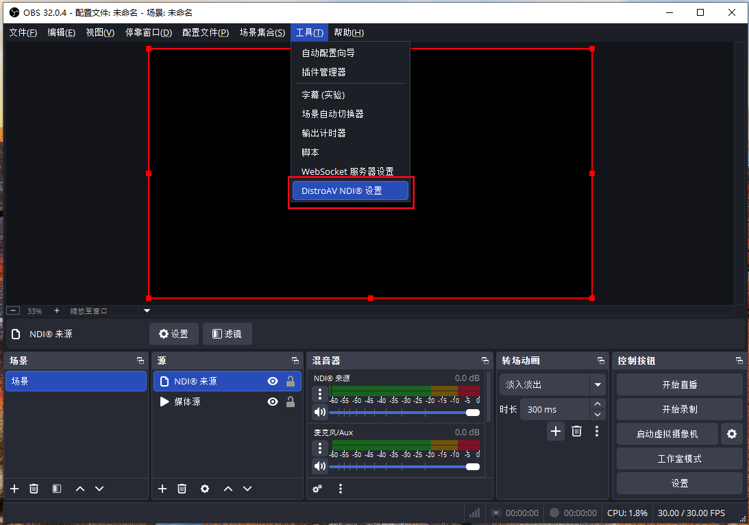 - 在 OBS 的菜单栏中选择 “工具 ”→ “DistroAVNDI 输出”设置。