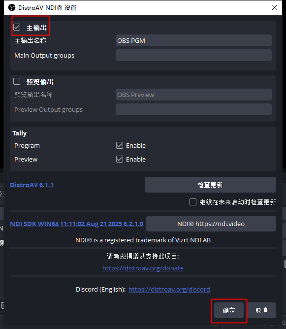 4. 点击 “确定”,OBS 将开始通过 NDI 输出节目画面。