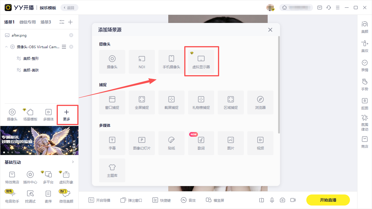 - 在 YY 开播主界面,点击添加场景源,在列表中选择虚拟显示器。