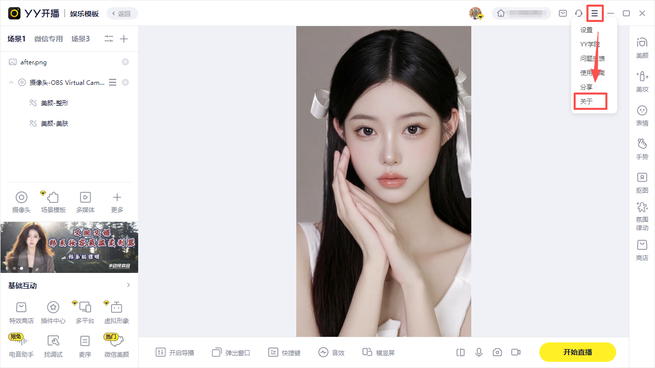 完成画面捕获后,可在直播伴侣美颜效果的基础上,叠加开启 YY 开播自带的美颜、美体等功能,灵活组合出最佳直播效果。