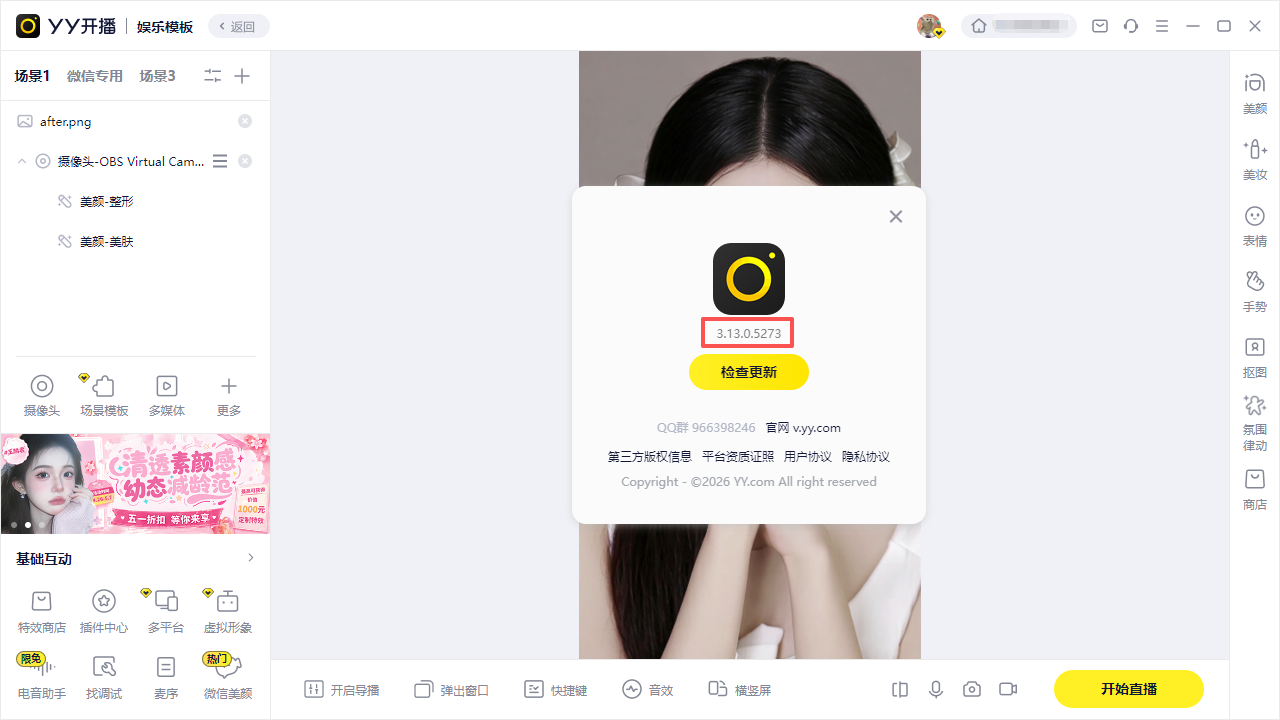 2. 若版本低于 v3.9,请前往官网v.yy.com下载最新版本,完成升级后再继续。