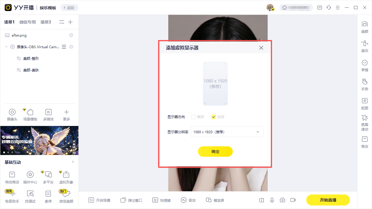 注意: 若 YY 开播当前为竖屏模式,虚拟显示器只能添加竖屏;横屏同理。如需切换横竖屏,请先在 YY 开播中切换横竖屏状态,再重新添加虚拟显示器。