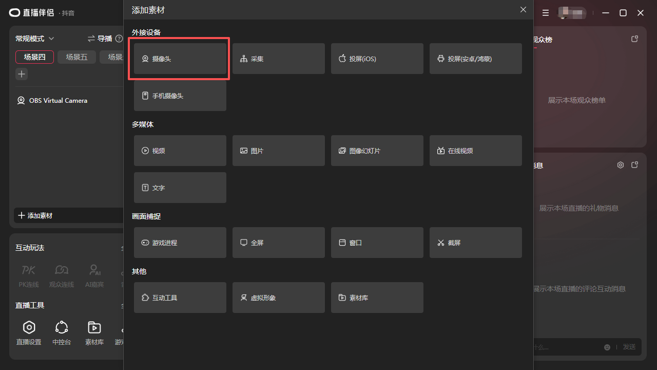 - 进入场景设置 > 添加素材,选择摄像头作为视频来源。