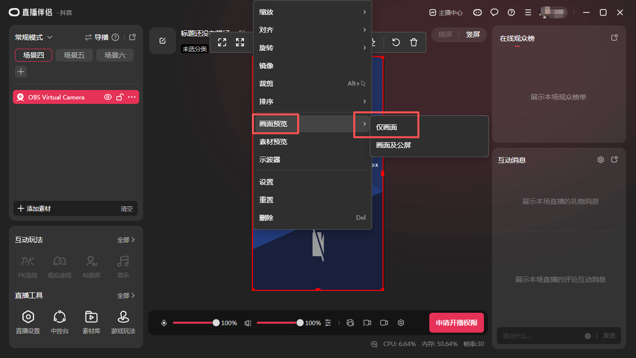 4. 点击画面 > 画面预览,确保弹出预览画面窗口并保持开启状态(这个窗口将在下一步被 YY 开播捕获)。