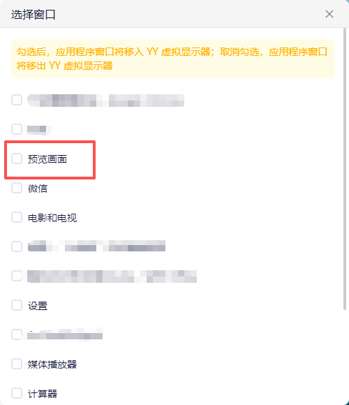 - 重新打开 YY 开播,点击添加场景源 > 虚拟显示器,完成添加后,屏幕上会弹出虚拟显示器交互弹窗。